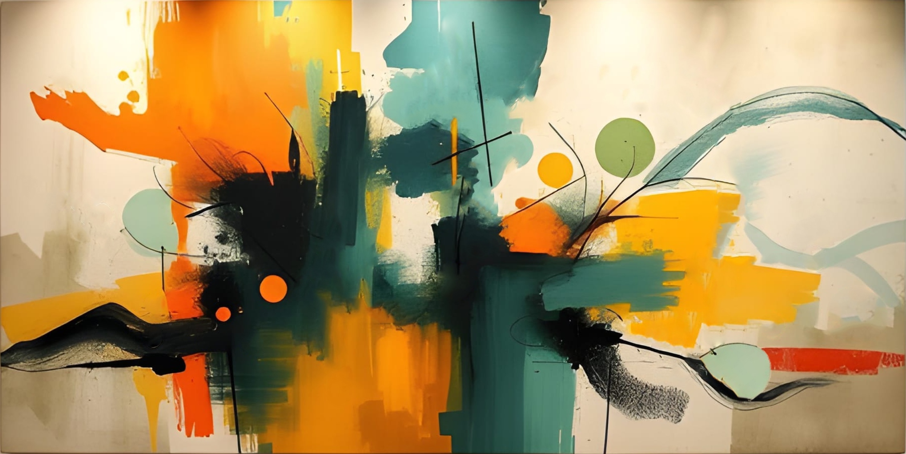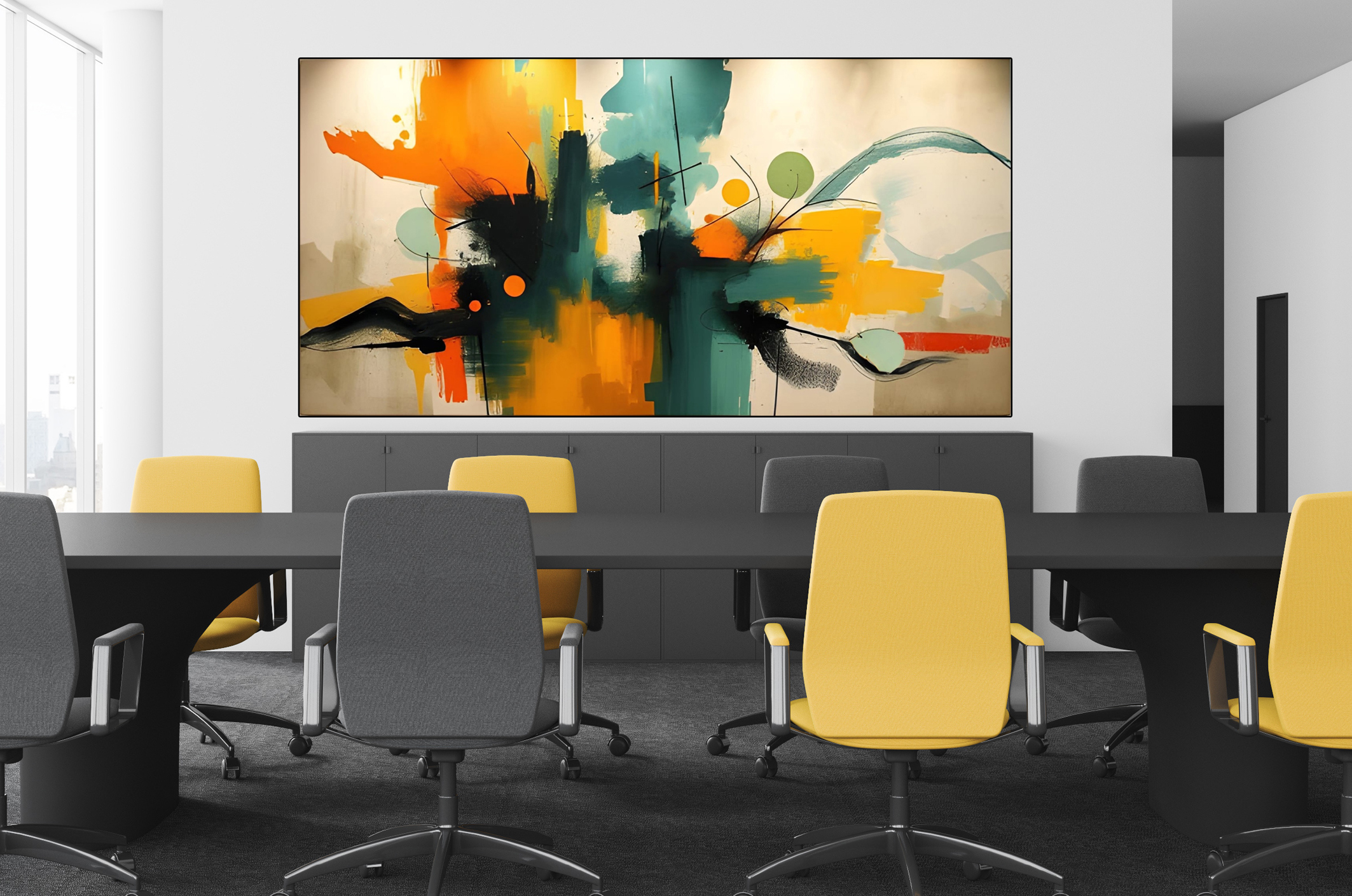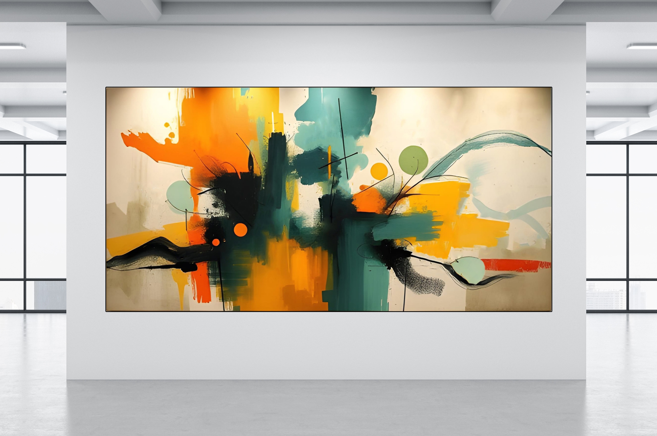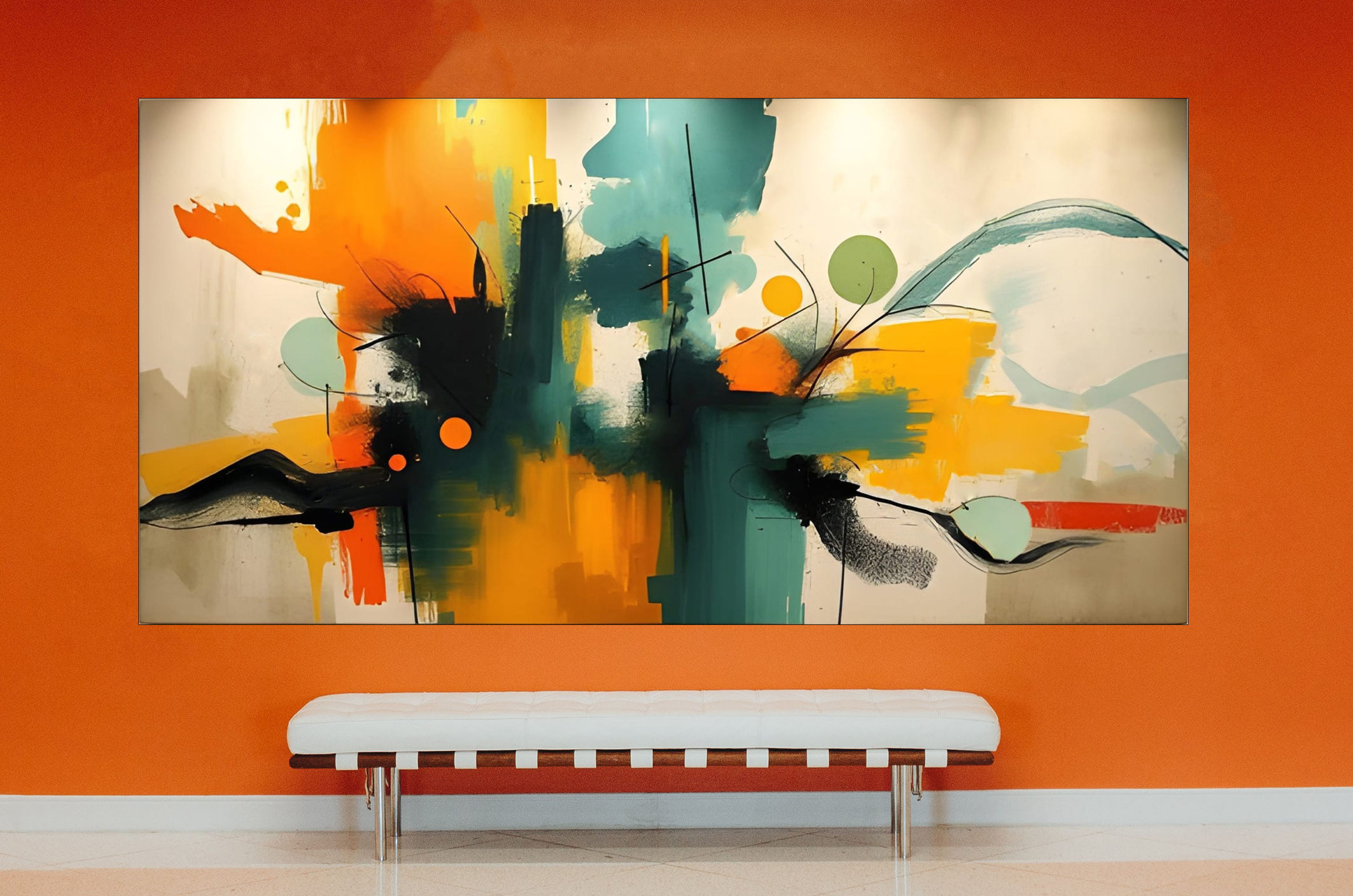Dieses Werk spielt bewusst mit Gegensätzen: ruhige Flächen kontrastieren mit punktuellen Akzenten, warme Töne wie Orange und Gelb treffen auf kühlere Nuancen in Creme und Grün. Die reduzierte, dennoch intensive Farbwahl entfaltet im Format 300 x 150 cm ihre ganze Wirkung – ideal für große Räume mit Anspruch an klare Bildsprache und moderne Gestaltung.