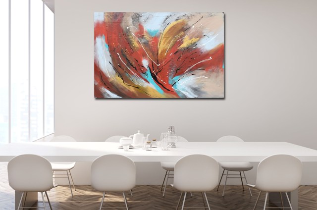Die gesamte Oberfläche wurde mit einer Versieglung, Schlussfirnis behandelt um das Bild zu schützen und die Farbintensivität zu verstärken. Es wurden hochwertige und lichtbeständige Acrylfarben auf mehrfach weiß grundierter Leinwand verwendet. Leinwand ist auf der Rückseite geklammert. Bitte, beachten Sie die Format- Angaben zu den Abmessungen. Da es bei den Wohnbeispielen um Fotomontagen handelt, es kann vorkommen, dass die Kunstwerke kleiner oder größer wirken. Die auf den Fotos dargestellten Accessoires und Möbel sind nicht Bestandteil meines Angebotes.