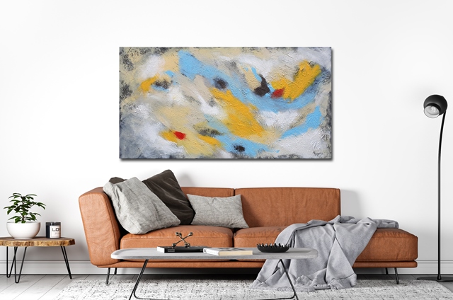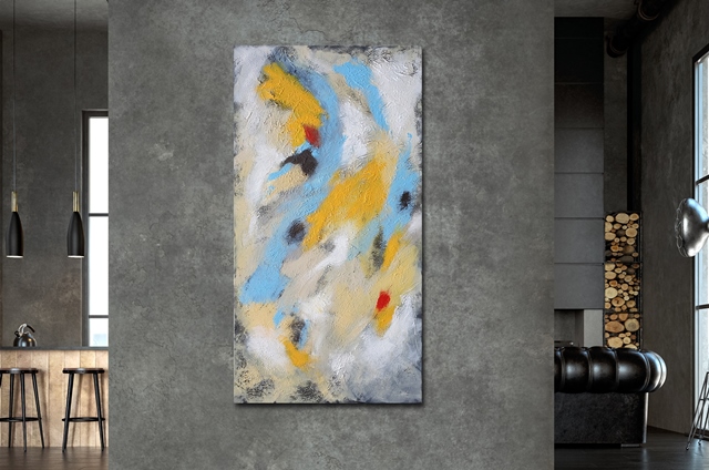 Die Komposition lebt von Lebendigkeit , die Farbkombination von kräftigen Gelb und Rot mit den pastellfarbigen Beige, Neaple, Blau und den dunkeln Braunton bringt Harmonie an der Wand. Im Background wurde die Farbe Schwarz verwendet um mehr Wirkung ins Kunstwerk zu bringen. Die Ausrichtung – ob im Quer- oder Hochformat – lässt sich flexibel anpassen und verändert die Wirkung des Bildes deutlich. Das Werk entfaltet eine zeitlose Eleganz, ohne dekorativ zu wirken. Wer moderne Kunst kaufen möchte, die Raum und Stimmung verbindet, findet hier ein echtes Unikat mit klarer künstlerischer Handschrift. Bei diesen Werk konnte man förmlich hören wie der Malpinsel über die vorab angelegten Strukturen streicht.