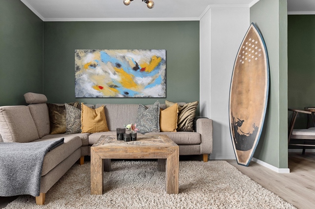 - Über einer Wohnlandschaft in den Farben Weiß, Braun, Cognac, Rot und Grau