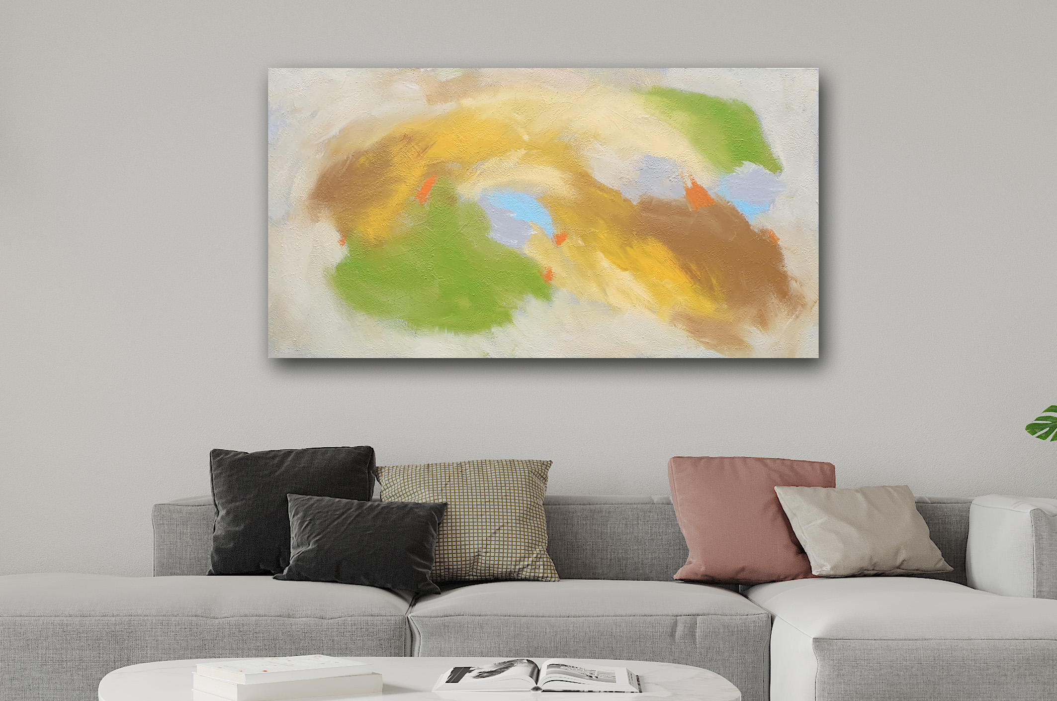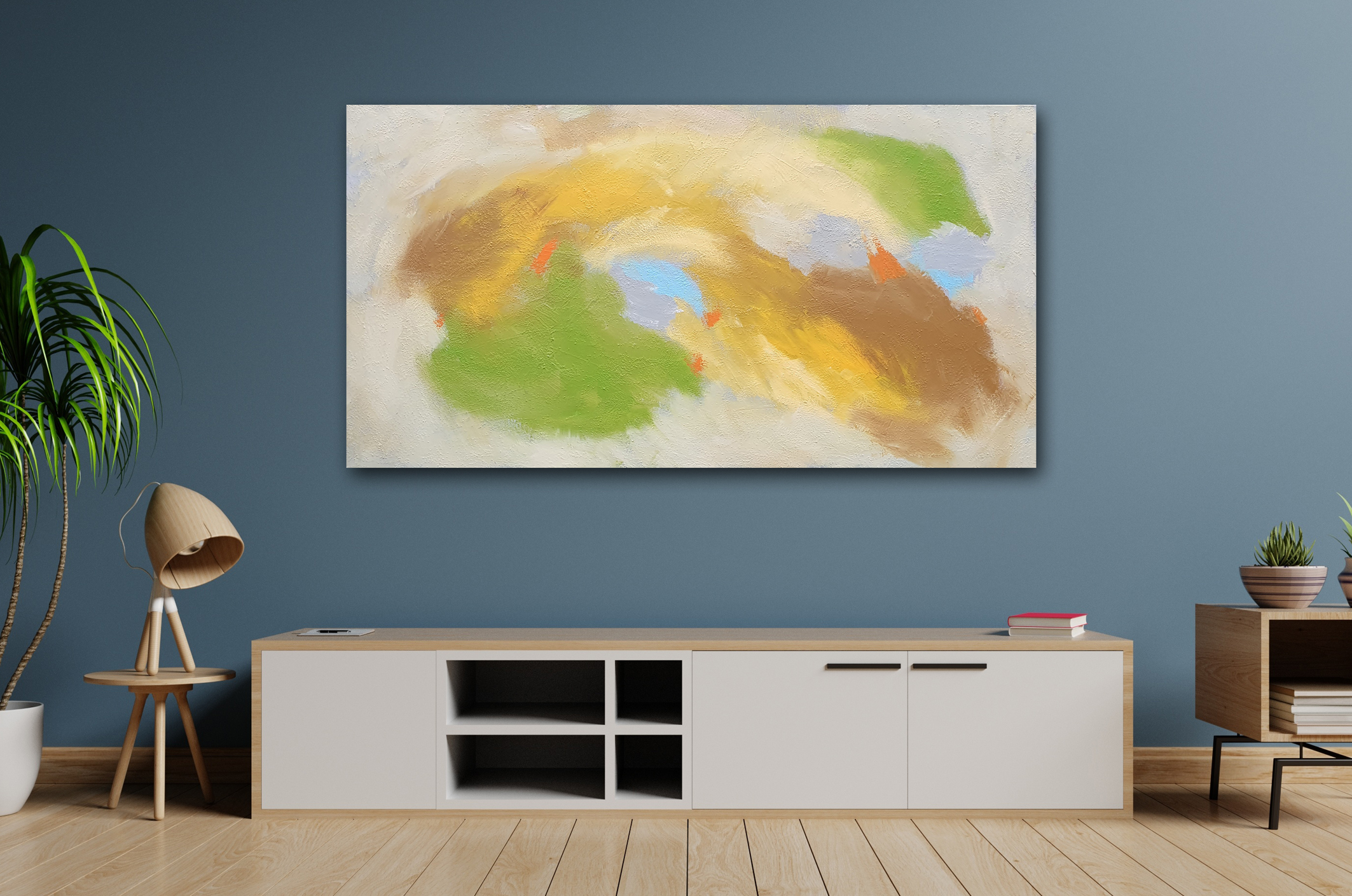 Durch das XXL-Format von 150 x 80 cm entsteht eine großzügige Präsenz an der Wand. Besonders über einem langen Sideboard in Holz, einer beigen Wohnlandschaft oder in einem modern eingerichteten Raum mit weißen Wänden entfaltet das Werk seine Wirkung. Es bringt Wärme in minimalistische Konzepte und unterstreicht natürliche Materialien wie Leinen, Holz oder Stein.