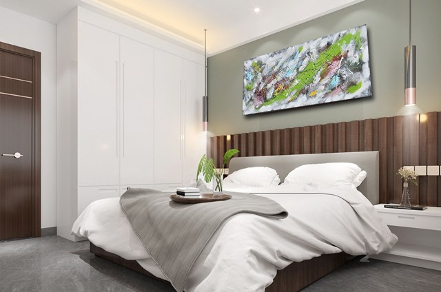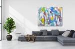 The action painting work brings a lot of atmosphere to your living space. The original work in a somewhat longer form of 200 x 100 cm has a wonderful image depth of 4 cm. Casual and casual with bright, colorful details: that were painted, spotted and raised on a large-format canvas and have a contrasting appearance with ice blue and light olive green in contrast to the black, sienna brown and havana brown.